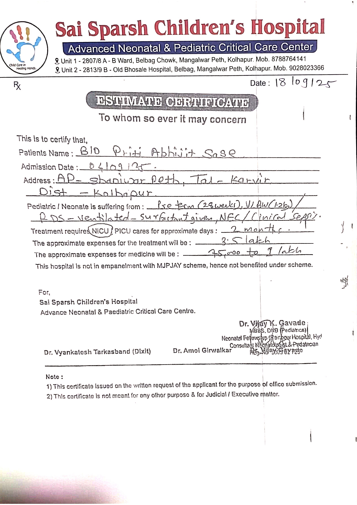 As a parent, we were prepared to do everything to ensure our newborn has a healthy life ahead. We were informed that the cost of the medical expense is Rs. 3,50,000/-.