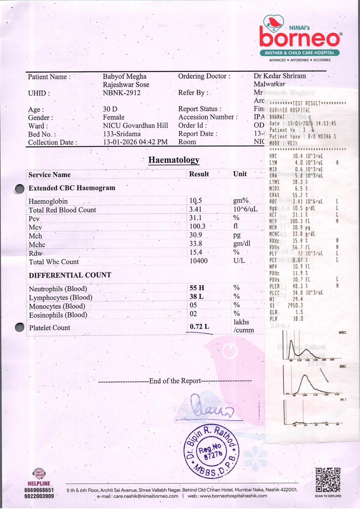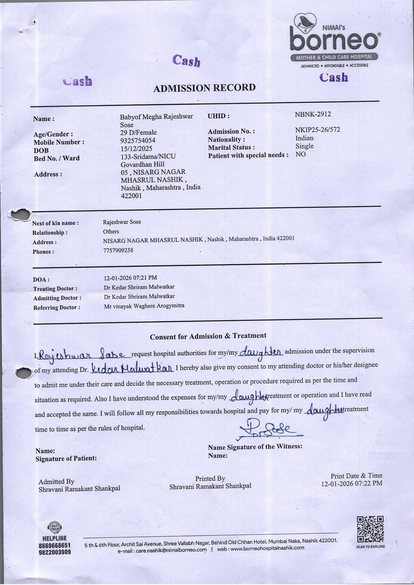 Baby of Megha Rajeshwar Sose, just one month old, is currently fighting for survival in the (NICU) at Nimai’s Borneo Mother and Child Care Hospital, Nashik. From the very moment she was born, her life has been a continuous medical battle. She was born extremely premature at 29 weeks and 1 day, weighing only 830 grams. Due to her fragile condition, she has remained in the NICU since birth, relying entirely on intensive medical care to stay alive.
