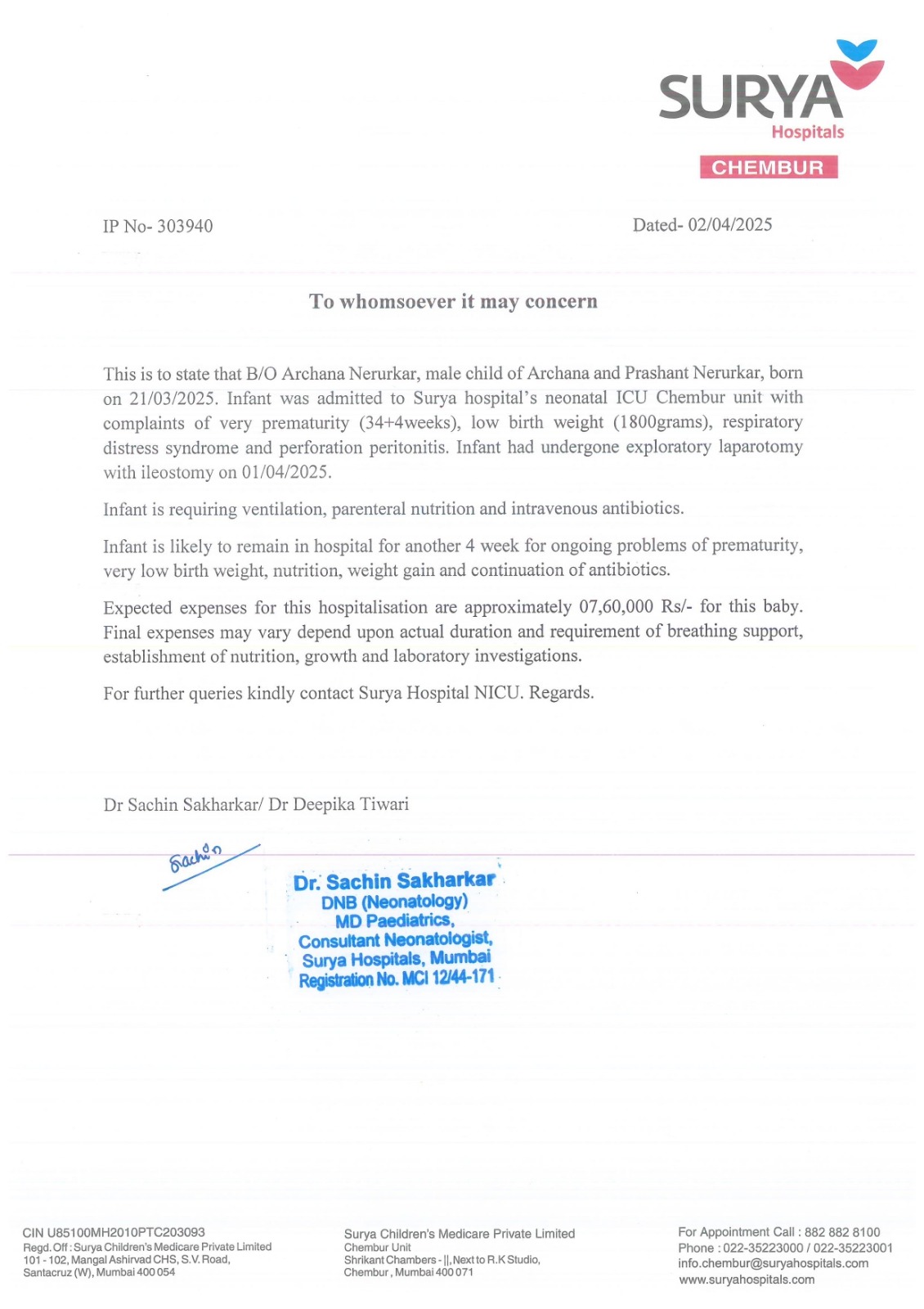 Son of Mrs. Archana Nerurkar, just 15 days old, is fighting for his life. Born extremely premature with very low birth weight (1.800 kgs), respiratory distress syndrome, her tiny body is battling immense pain every moment.